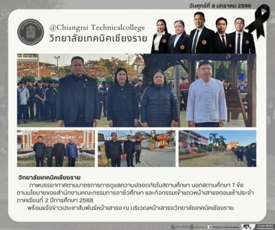 7 วัน ที่ผ่านมาวันพฤหัสบดีที่ 8 มกราคม 2569 🌟🌟วิทยาลัยเทคนิคเชียงราย🌟🌟นายชัชวาล วงศ์ใหม่ ผู้อำนวยการวิทยาลัยเทคนิคเชียงราย ให้การต้อนรับคณะตัวแทนจากโรงเรียนสอนภาษาซากุระ เชียงราย ที่ได้เข้าพบสวัสดีปีใหม่ เนื่องในโอกาสสวัสดีปีใหม่ ปี พ.ศ. 2569 พร้อมอวยพรปีใหม่และให้คติพจน์ในการดำเนินงาน เพื่อความเป็นสิริมงคลต้อนรับปีใหม่ ณ วิทยาลัยเทคนิคเชียงราย