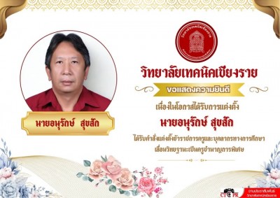 วันพฤหัสบดีที่ 18 กันยายน 2568 🌟🌟วิทยาลัยเทคนิคเชียงราย🌟🌟ขอแสดงความยินดีกับ ครูอนุรักษ์ สุขสัก ข้าราชการครู ที่ได้รับคำสั่งแต่งตั้งข้าราชการครูและบุคลากรทางการศึกษา เลื่อนเป็นวิทยฐานะ #ตำแหน่งครูชำนาญการพิเศษ สังกัดสำนักงานคณะกรรมการการอาชีวศึกษา