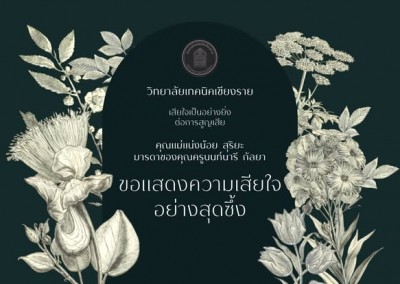 วันศุกร์ที่ 19 กันยายน 2568 🌟🌟วิทยาลัยเทคนิคเชียงราย🌟🌟นำโดยนายชัชวาล วงศ์ใหม่ ผู้อำนวยการวิทยาลัยเทคนิคเชียงราย พร้อมด้วยคณะรองผู้อำนวยการวิทยาลัยเทคนิคเชียงราย คณะครู อาจารย์ และบุคลากรวิทยาลัยเทคนิคเชียงราย ร่วมเป็นเจ้าภาพสวดอภิธรรมแก่มารดาของครูนนท์นารี กัลยา ครูแผนกวิชาสามัญสัมพันธ์ ที่ได้สูญเสียคุณแม่แน่งน้อย สุริยะ ซึ่งเป็นมารดาได้เสียชีวิต และกำหนดตั้งศพบำเพ็ญกุศล ณ บ้านเลขที่ 5 หมู่ที่ 8 ต.สว่างอารมณ์ อ.ดอกคำใต้ จ.พะเยา กำหนดพิธีสวดอภิธรรม วันที่ 17 - 19 กันยายน 2568 เวลา 19.30 น. และกำหนดพิธีฌาปนกิจ วันที่ 20 กันยายน 2568 เวลา 09.00 น. เคลื่อนศพไปยังสุสานเพื่อฌาปนกิจ เวลา 12.00 น. ขอแสดงความเสียใจอย่างสุดซึ้งขอให้คุณงามความดีที่ท่านสั่งสมมา จงน้อมนำแล้วส่ง ดวงวิญญาณ สู่สุคติสัมปรายภพ