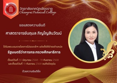 ✨✨วิทยาลัยเทคนิคเชียงราย✨✨ขอแสดงความยินดี 2 รัฐมนตรี กระทรวงศึกษาธิการ ศาสตราจารย์นฤมล ภิญโญสินวัฒน์ ได้รับพระบรมราชโองการโปรดเกล้าฯ แต่งตั้งให้ดำรงตำแหน่ง รัฐมนตรีว่าการกระทรวงศึกษาธิการ ตั้งแต่วันที่ 30 มิถุนายน 2568 - 19 กันยายน 2568 และดำรงตำแหน่งสมัยที่สอง ตั้งแต่วันที่ 19 กันยายน 2568 นายองอาจ วงษ์ประยูร ได้รับพระบรมราชโองการโปรดเกล้าฯ แต่งตั้งให้ดำรงตำแหน่ง รัฐมนตรีช่วยว่าการกระทรวงศึกษาธิการ ตั้งแต่วันที่ 19 กันยายน 2568