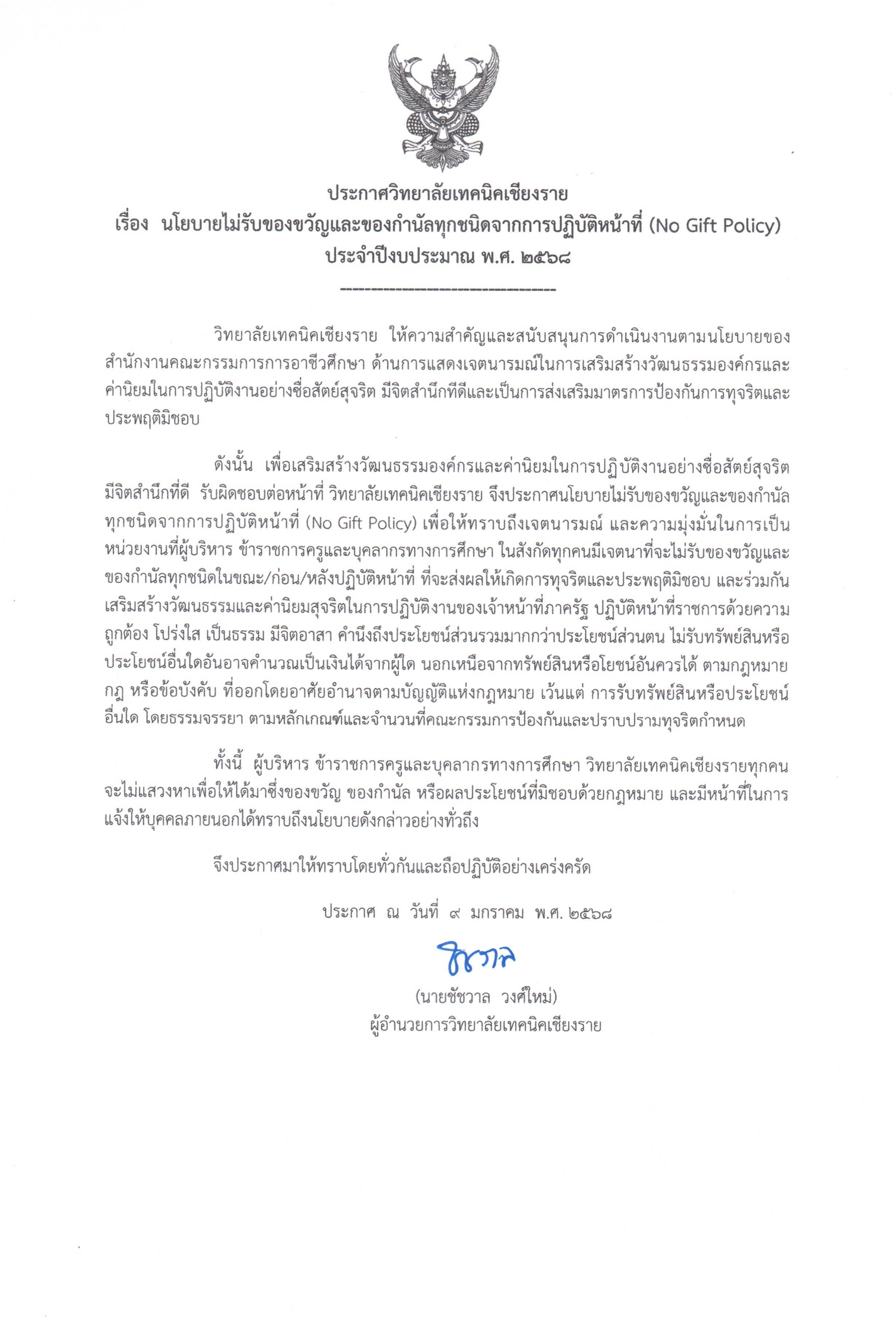 o30 นโยบายไม่รับ ของขวัญ (No Gift Policy) - แสดงนโยบายว่าผู้บริหาร เจ้าหน้าที่ และบุคลากร ทุกคนจะต้องไม่มีการรับของขวัญ (No Gift Policy)