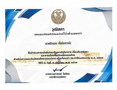 วันอังคารที่ 11 มิถุนายน 2567 ✨✨✨วิทยาลัยเทคนิคเชียงราย ✨✨✨ ขอแสดงความยินดี กับนายธีรเมธ ปักโคทานัง และนายทักษพงศ์ ใจยา นักเรียนระดับ ปวช. เข้าร่วมการแข่งขันตอบปัญหาเชิงวิชาการเกี่ยวกับวุฒิสภา และการเมืองการปกครองของไทย สำหรับเยาวชนระดับมัธยมศึกษาตอนปลายหรือเทียบเท่า ประจำปี 2567 รอบคัดเลือกระดับภูมิภาค (ภาคเหนือ) ในวันศุกร์ที่ 7 มิถุนายน 2567 จังหวัดพิษณุโลก โดยดร.ศรากร บุญปถัมภ์ ผู้อำนวยการวิทยาลัยเทคนิคเชียงรายได้ให้เกียรติมอบเกียรติบัตรให้กับนักเรียน และครูผู้ควบคุม บริเวณหน้าเสาธง วิทยาลัยเทคนิคเชียงราย #เรียนดี มีความสุข