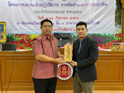 วันอาทิตย์ที่ 10 กันยายน 2566 ดร.ศรากร บุญปถัมภ์ ผู้อำนวยการวิทยาลัยเทคนิคเชียงราย ได้กล่าวต้อนรับและมอบของที่ระลึกให้กับคณะวิทยากร คือ ครูมงคล แก่กล้า และครูยศพนธ์ อินทรจันทร์ ครูจากวิทยาลัยเทคนิคบ้านค่าย ที่ท่านได้มาให้ความรู้ในเรื่อง การอบรมเชิงปฏิบัติการ การจัดทำแผนการฝึกอาชีพ ประจำปีงบประมาณ 2566 และในการนี้ท่านผู้อำนวยการวิทยาลัยเทคนิคเชียงราย ได้มอบเกียรติบัตรให้แก่คณะครูจากวิทยาลัยต่างๆ ของสำนักงานอาชีวศึกษาจังหวัดเชียงราย ทั้ง 8 แห่ง ที่เข้ารับการอบรมโครงการอบรมเชิงปฏิบัติการ การจัดทำแผนการฝึกอาชีพ ประจำปีงบประมาณ พ.ศ. ๒๕๖๖ ในวันที่ ๙-๑๐ กันยายน ๒๕๖๖ ณ ห้องพระวิษณุกรรม ๑ ชั้น ๓ อาคารเฉลิมพระเกียรติ วิทยาลัยเทคนิคเชียงราย