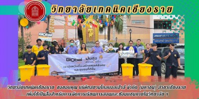 บริษัทสยามโกลบอลเฮ้าส์ จำกัด (มหาชน) สาขาเชียงราย เข้ามอบอุปกรณ์เพื่อใช้เป็นสื่อสำหรับการจัดการเรียนการสอน และซ่อมแชมภายในวิทยาลัยฯ โดยมีนายสุรพงค์ สันติพงค์ รองผู้อำนวยการฝ่ายกิจการนักเรียน นักศึกษา พร้อมด้วยรองผู้อำนวยการฝ่ายบริหารทรัพยากร รองผู้อำนวยการฝ่ายวิชาการ ตัวแทนครู และนักเรียน นักศึกษา รับมอบสิ่งของดังกล่าว ณ วิทยาลัยเทคนิคเชียงราย