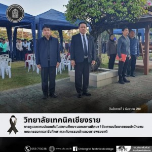 พิธี ศตวรรษามหาธีรราชานุสรณ์ ครบรอบ 100 ปี วันสวรรคต รัชกาลที่ 6 น้อมรำลึกพระมหากรุณาธิคุณผู้พระราชทานกำเนิดลูกเสือไทย วันอังคารที่ 25 พฤศจิกายน 2568 เวลา 08.30 น ✨✨วิทยาลัยเทคนิคเชียงราย✨✨นายชัชวาล วงศ์ใหม่ ผู้อำนวยการวิทยาลัยเทคนิคเชียงราย มอบหมายให้ คณะครูผู้กำกับลูกเสือและลูกเสือวิสามัญฯ ร่วมวางพวงมาลา กล่าวถวายราชสดุดี และร่วมยืนสงบนิ่งเพื่อรำลึกถึงพระมหากรุณาธิคุณขององค์พระมหาธีรราชเจ้า พร้อมกันนี้ยังมีการจัดนิทรรศการเกี่ยวกับพระราชประวัติและกิจการลูกเสือไทย เพื่อให้เยาวชนและผู้เข้าร่วมงานได้ศึกษาและตระหนักถึงคุณค่าของการบำเพ็ญประโยชน์และความมีระเบียบวินัยในแบบลูกเสือ จัดขึ้นโดยสำนักงานลูกเสือจังหวัดเชียงราย ซึ่งได้รับเกียรติจากนายประสงค์ หล้าอ่อน รองผู้ว่าราชการจังหวัดเชียงราย เป็นประธานในพิธีถวายพวงมาลาและถวายราชสดุดี พระบาทสมเด็จพระมงกุฎเกล้าเจ้าอยู่หัว (รัชกาลที่ 6) เนื่องในงาน ศตวรรษามหาธีรราชานุสรณ์ ครบรอบ 100 ปี วันคล้ายวันสวรรคต ประจำปี 2568 ณ ศูนย์พัฒนาบุคลากรทางการลูกเสือยุวกาชาดและกิจกรรมเยาวชนจังหวัดเชียงราย ต.แม่ยาว อ.เมืองเชียงราย