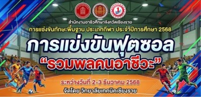 วันอังคารที่ 2 ธันวาคม 2568 ⚽️กีฬาฟุตซอล ⚽️ การแข่งขันทักษะพื้นฐานประเภทกีฬาประจำปีการศึกษา 2568 'คนรวมพลคนอาชีวะ' ระหว่างวันที่ 2-3 ธันวาคม 2568 จัดโดยวิทยาลัยเทคนิคเชียงราย