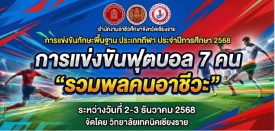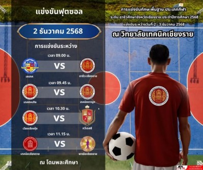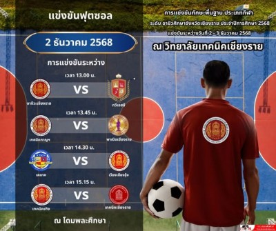วันอังคารที่ 2 ธันวาคม 2568 ⚽️กีฬาฟุตบอลชาย 7 คน ⚽️ การแข่งขันทักษะพื้นฐานประเภทกีฬาประจำปีการศึกษา 2568 'คนรวมพลคนอาชีวะ' ระหว่างวันที่ 2-3 ธันวาคม 2568 จัดโดยวิทยาลัยเทคนิคเชียงราย